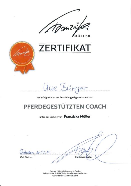 Mit der Ausbildung zum „Pferdegestützten Coach“ bei Franziska Müller, möchte Uwe Menschen ihre Möglichkeiten aufzeigen, ihr Leben in Frieden, selbst bestimmt zu leben und Hindernisse zu überwinden!!
